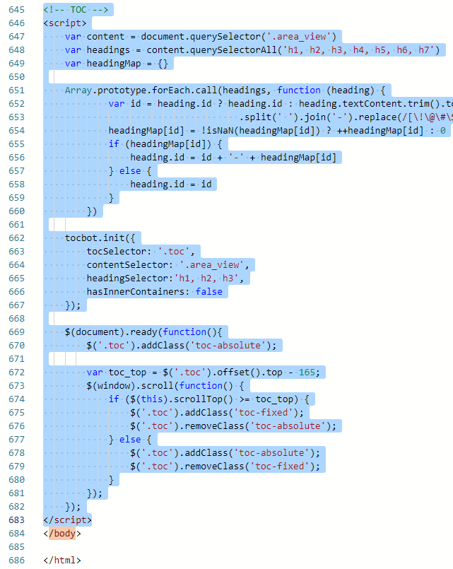 <link rel="stylesheet" href="https://cdnjs.cloudflare.com/ajax/libs/tocbot/4.11.1/tocbot.css">/head를 검색하여 그 위에 추가하면 좋다.